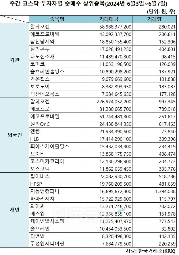 기관 '알테오젠'·외인 '알테오젠'·개인 '펄어비스' 1위 [주간 코스닥 순매수- 6월3일~6월7일]