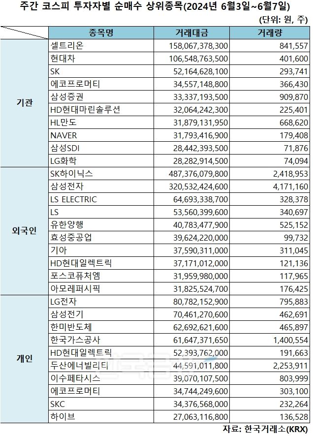 기관 '셀트리온'·외인 'SK하이닉스'·개인 'LG전자' 1위 [주간 코스피 순매수- 6월3일~6월7일]