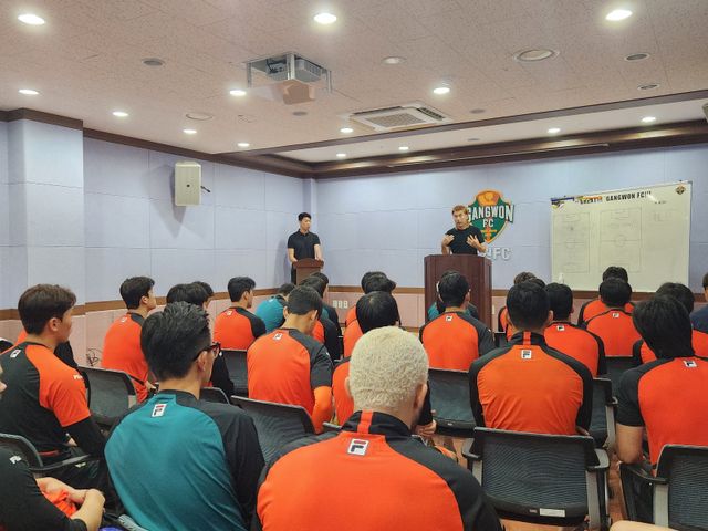 김병지 대표는 9일 오전 강원특별자치도 강릉시 오렌지하우스에서 선수단과 소통하는 시간을 보냈다. K리그 최다 출장에 빛나는 김병지 대표는 자신의 선수 생활 노하우를 바탕으로 다양한 주제에 대해 소통했다. 선수단은 진지하게 김병지 대표의 이야기를 경청했다.