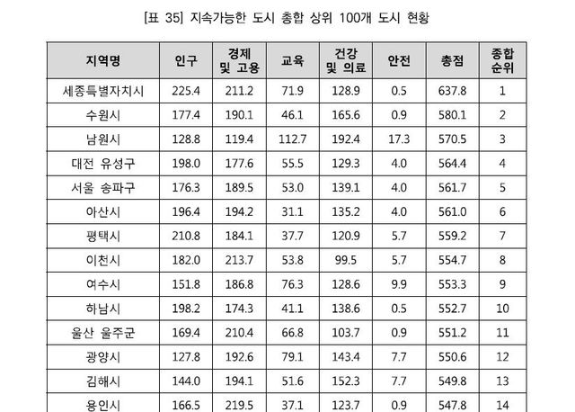 5개 영역 25개 지표를 토대로 측정한 지속 가능한 도시 총합에서 세종시는 총점 637.8점을 기록, 시군구 부문 및 시군구-기초구 통합 부문 종합 1위를 차지했다.