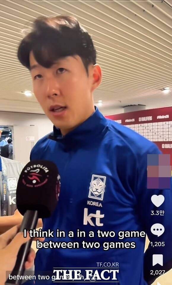 축구선수 손흥민이 6일 열린 2026 북중미월드컵 싱가포르전에서 승리를 거둔 후 진행한 인터뷰가 화제다. /틱톡 화면 캡처