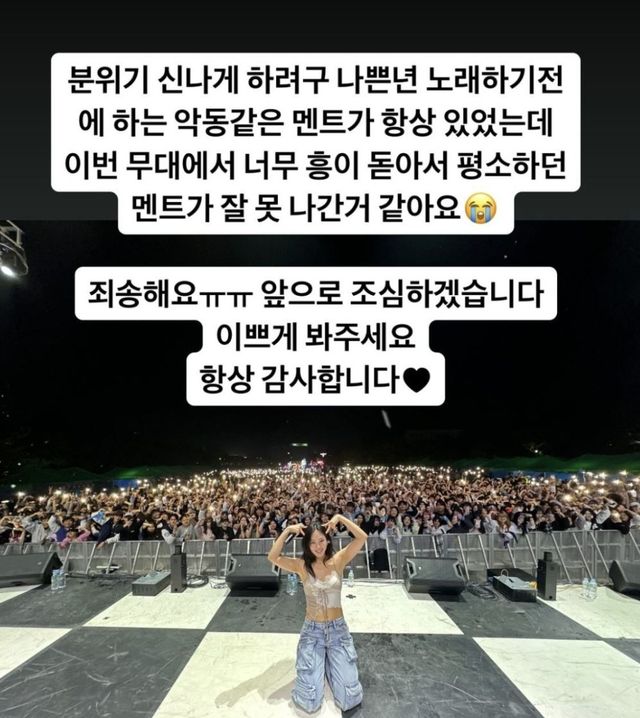그러면서 "죄송해요. 앞으로 조심하겠습니다. 이쁘게 봐주세요. 항상 감사합니다"라고 덧붙이며 고개를 숙였다. 현장 분위기가 좋았다는 것을 증명하는 듯 축제 당시 관객들과 찍은 사진을 공개하기도 했다.
