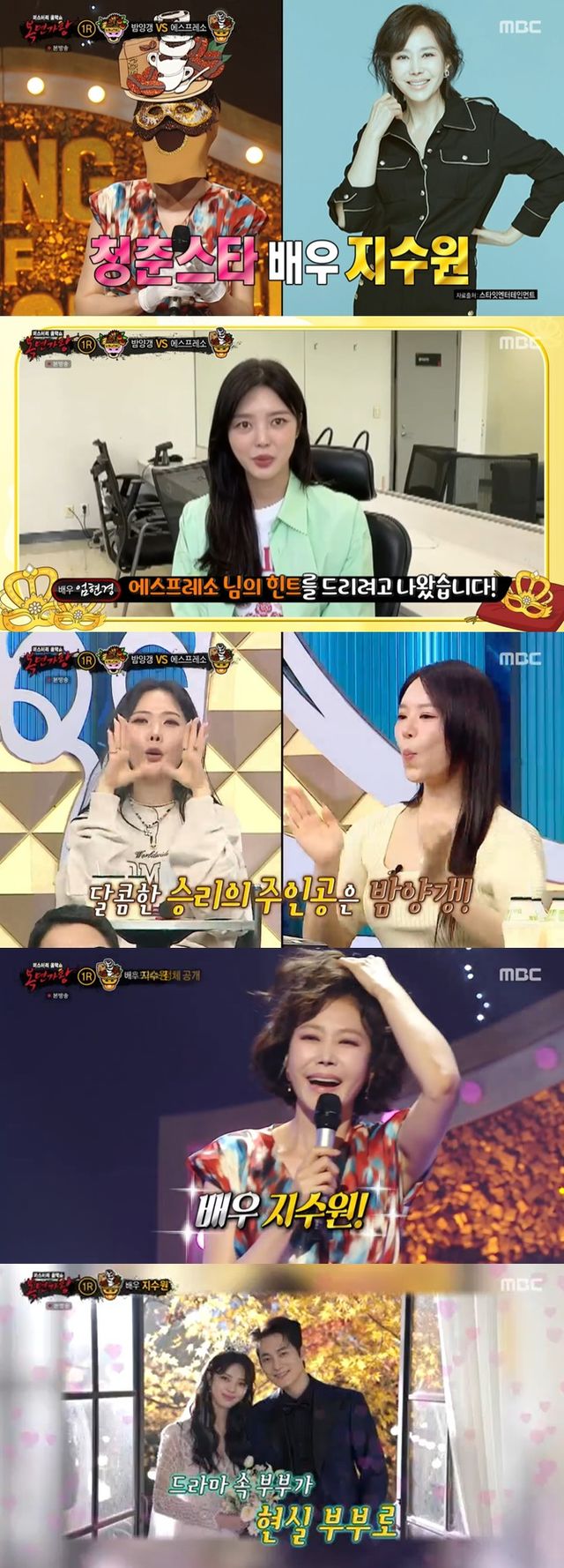 이에 지인으로 배우 엄현경이 등장해 "제가 존경하는 에스프레소 힌트는 언니처럼 다정하고 엄마처럼 따뜻한 분이다. 장혁, 송승헌, 강다니엘 포함해 정신적 지주다. 한국의 샤론스톤. 당대 최고 화장품, 음료 cf를 섭렵한 분이다"라며 추측에 도움을 줬다.