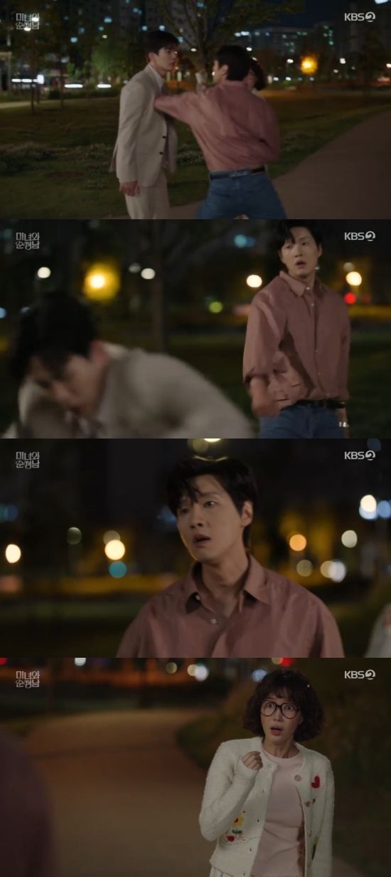 공진단은 김지영의 팔을 세게 붙잡았고, 이때 고필승이 나타나 공진단의 얼굴에 주먹을 날렸다.