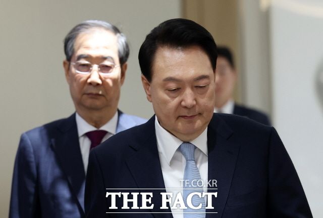 이번 개각은 지지층 이탈 국면에서 전환을 꾀할 수 있다는 점에서 의미가 더 크다. 지난 4월 16일 서울 용산 대통령실 청사에서 열린 국무회의에 한덕수 국무총리와 함께 입장하는 모습. /대통령실 제공