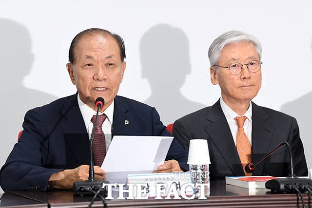 황우여 국민의힘 비상대책위원장이 '2인 지도체제'를 띄우면서 당내 갑론을박이 이어지고 있다. 지난 4일 황 위원장이 오전 서울 여의도 국민의힘 당사에서 열린 당헌당규개정특위 1차 회의에서 발언하고 있다. 오른쪽은 여상규 당헌당규 개정특위 위원장. /남윤호 기자