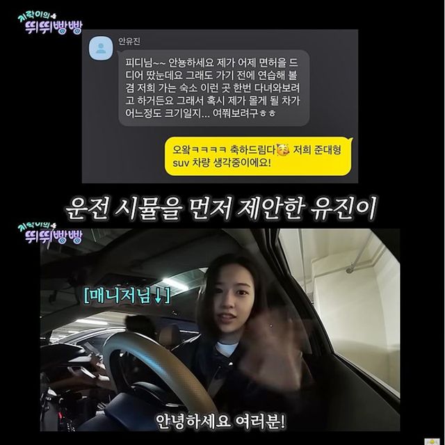 ‘지락이의 뛰뛰빵빵’은 나영석 PD가 제작한 ‘뿅뿅 지구오락실’의 스핀오프로 안유진을 포함한 이은지, 미미, 이영지가 여행 계획부터 요리, 돈 관리, 촬영까지 모두 자급자족하며 즐기는 3박 4일간의 여행기를 그린다. 멤버들은 가평 여행 당일까지 운전면허 취득하기 미션을 받았다. ‘똑쟁이’라는 별명 답게 안유진은 단번에 면허시험에 합격했다. “노 시간, 노 자본”이라고 당당히 외치며 이마에 운전면허증을 붙이는 엉뚱함도 보였다. 특히 1종보통 면허 기능 시험에 10번이나 도전한 이영지와 비교돼 웃음을 안겼다.