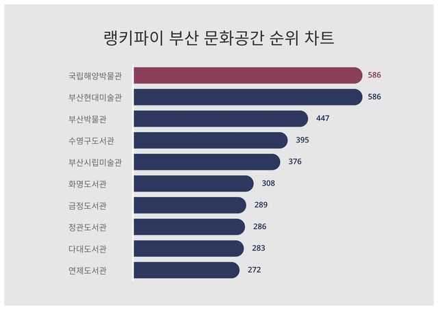 차트를 살펴보면 국립해양박물관이 586포인트로 해당 부문 1등을 기록했다. 바로 뒤 부산현대미술관이 586포인트로 2등을 차지했다.