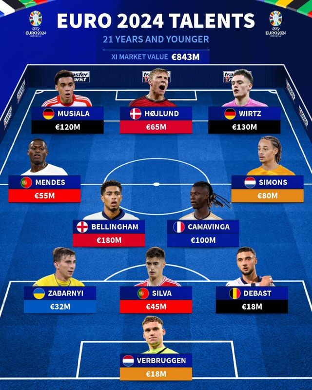 한 축구 통계 매체가 이번 달 독일에서 열리는 유럽축구연맹(UEFA) 선수권대회(유로)에 참가하는 21세 이하 ‘영건’ 베스트11을 공개해 눈길을 끌었다. 이들의 몸값 합계는 무려 8억 4300만 유로(약 1조 2500억원)에 달한다.