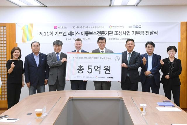 [M투데이 이세민 기자] 메르세데스-벤츠 사회공헌위원회는 부산광역시 연제구 소재 부산시청에서 기부금 전달식을 진행하고, ‘제11회 메르세데스-벤츠 기브앤 레이스(GIVE ‘N RACE)’를 통해 조성된 기부금 5억 원을 아동보호전문기관 지원을 위해 전달했다고 10일 밝혔다.