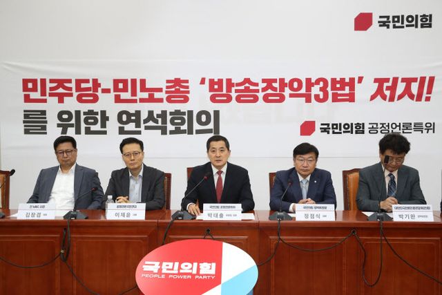 국민의힘 공정언론 특별위원회 위원장을 맡은 박대출 국민의힘 의원은 이날 오전 국회에서 열린 ‘방송장악 3법 저지 연석회의’에서 “민노총이나 언론 노조의 입맛대로 방송사 이사회 구성을 마음대로 할 수 있는 방송 장악 3법은 언론의 공정성과 독립성을 침해한다”며 “야권이 숫자의 힘으로 이를 밀어붙이면 거부권 대상이 될 것”이라고 경고했다.