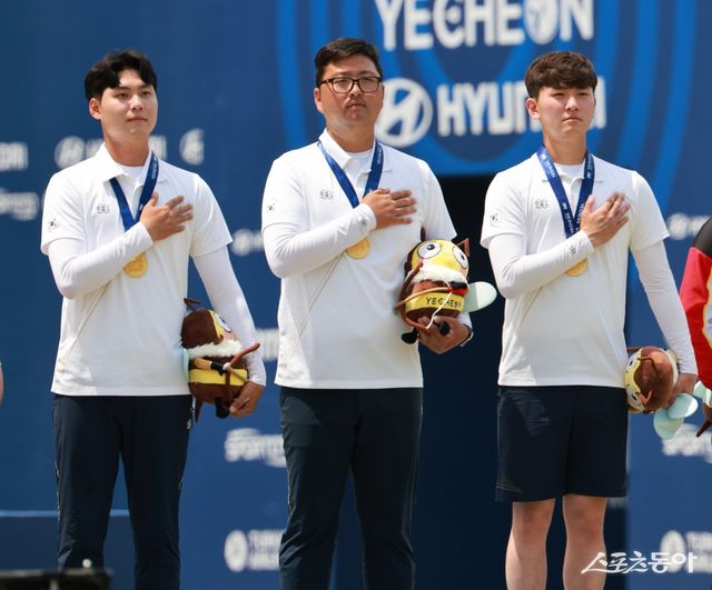 남자양궁국가대표팀 선수들이 지난달 26일 경북 예천 진호국제양궁장에서 열린 2024현대양궁월드컵 2차 대회 남자단체전 우승 후 시상대에 올랐다. 금메달을 목에 건 이우석, 김우진, 김제덕(왼쪽부터). 사진제공 | 대한양궁협회