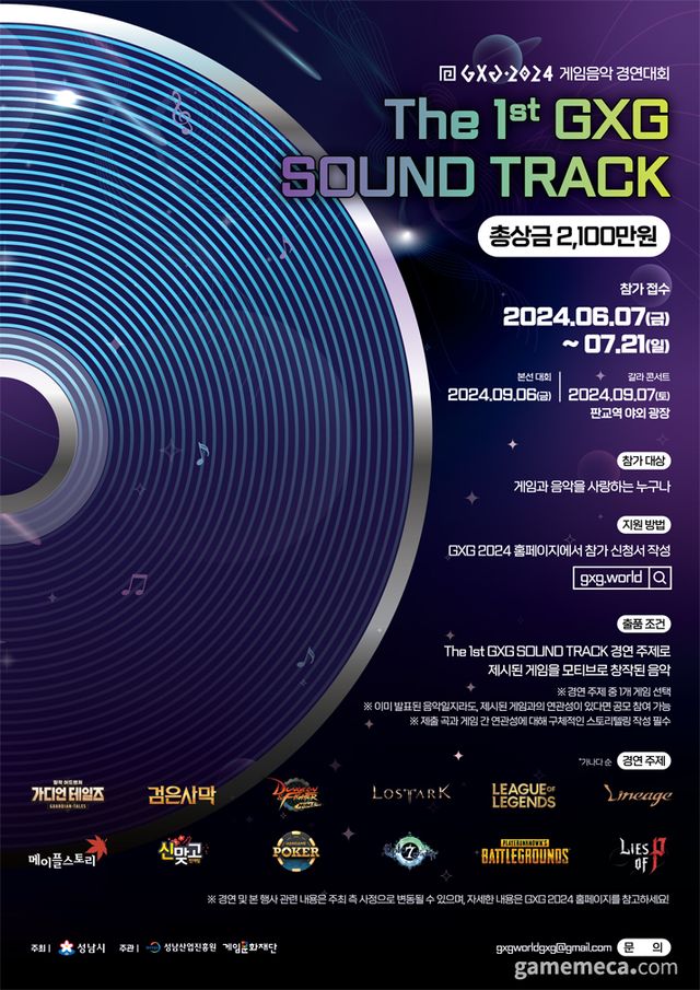 GXG는 완성된 게임을 체험하는 것을 넘어 문화예술 분야로 인정받은 게임의 다양한 요소에 초점을 맞춘 문화축제다. 이번에는 음악을 메인 테마로 하여, 게임을 모티브로 한 창작곡을 겨루는 경연대회를 선보인다. 게임과 음악에 관심이 있는 누구나 참여 가능하며, 총 상금 2,100만 원 규모다.
