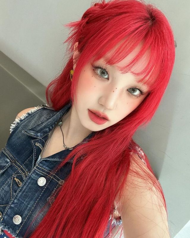 ‘쿨톤=레드’ 공식으로 레드 컬러를 엄두도 내지 못했던 웜톤이라면 르세라핌 허윤진을 참고해주세요. 레드 오렌지가 연상되는 따뜻한 레드 색상으로 따뜻하면서도 강렬한 느낌을 줘 평소 레드 컬러가 어려웠던 분들에게도 좋은 예시가 되어줄 거예요.