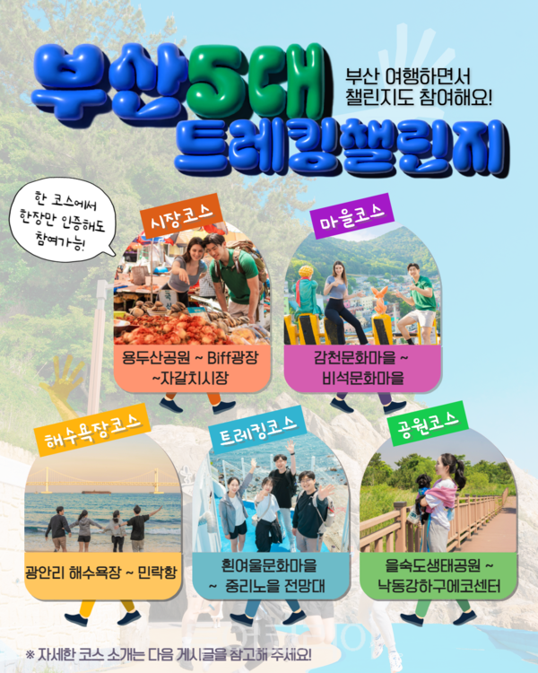 [투어코리아=이철진 기자] 부산관광공사는 지속 가능한 여행문화 조성과 탄소 절감을 위한 ‘2024 부산5대트레킹챌린지’캠페인을 오늘(10일)부터 10월 31일까지 개최한다.