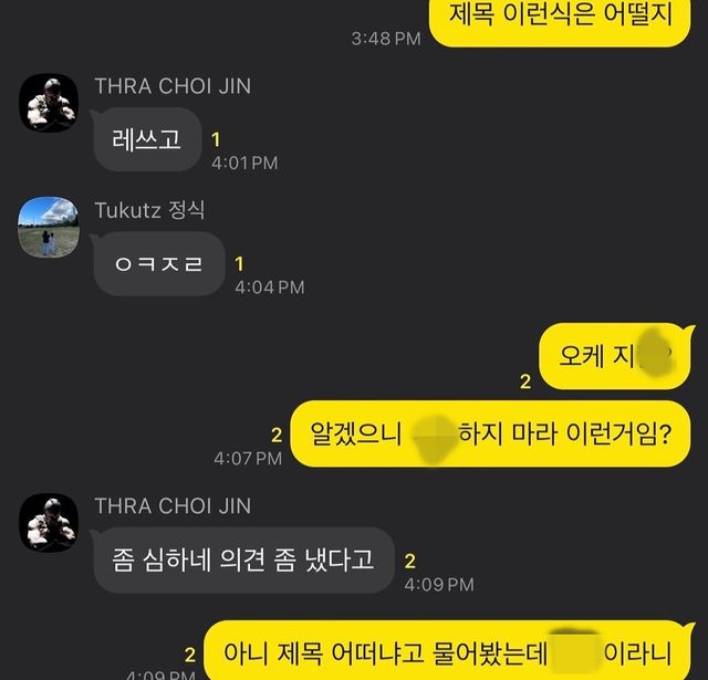 타블로는 "제목 이런식은 어떨지"라고 말했고, 미쓰라는 "레쓰고"라고 대답했다. 반면 투컷은 "ㅇㅋㅈㅂ"라고 답했는데, 이를 본 타블로는 "오케 지X? 알겠으니 XX하지 마라 이런거임?"이라는 반응을 보였다.