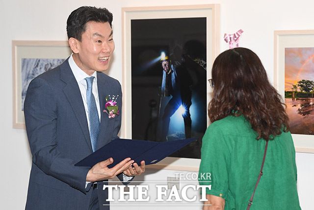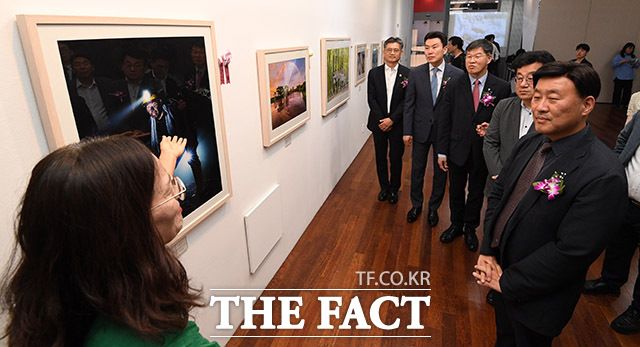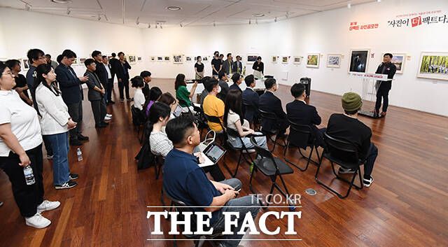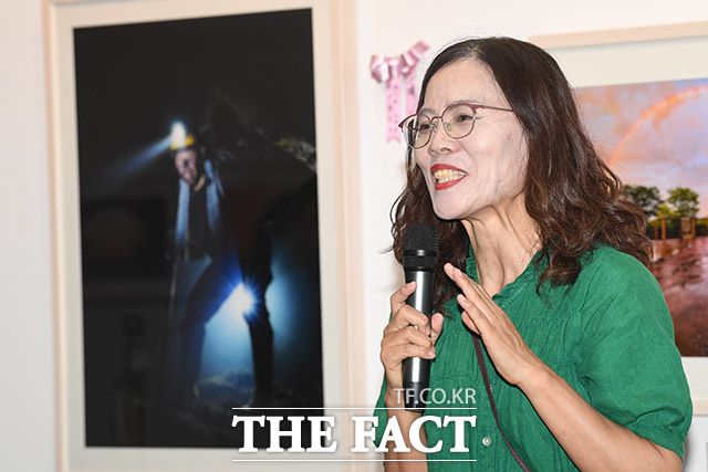 더팩트 사진전 대상 수상자인 김미영 씨(왼쪽)가 내빈들에게 작품 설명을 하고 있다.