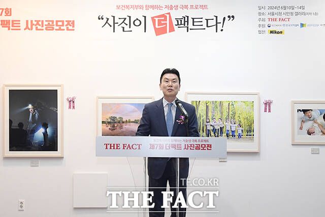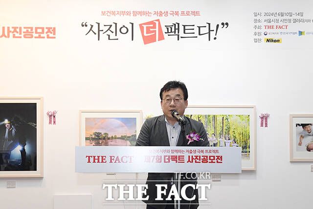 [더팩트ㅣ남윤호·장윤석·서예원 기자] '보건복지부와 함께하는 저출생 극복 프로젝트 <사진이 '더'팩트다>' 시상식이 10일 오후 서울 중구 서울시청 시민청 갤러리에서 열린 가운데 김상규 더팩트 대표이사가 축사하고 있다.