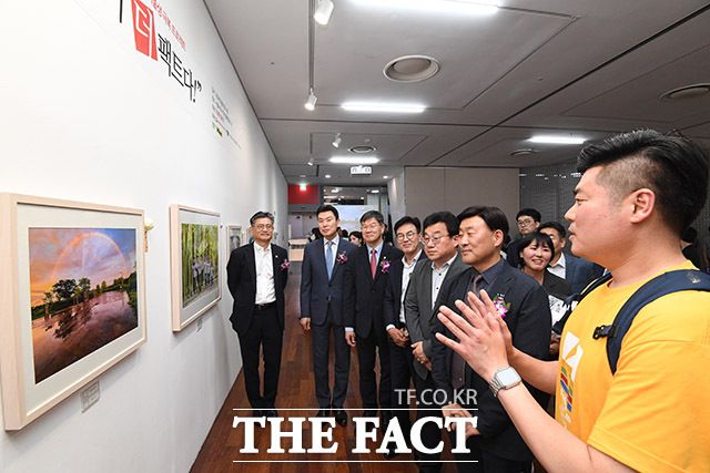 <사진이 '더'팩트다>' 사진 공모전에서 '광부'로 대상을 수상한 김미영 씨(왼쪽)가 내빈들에게 작품 설명을 하고 있다.