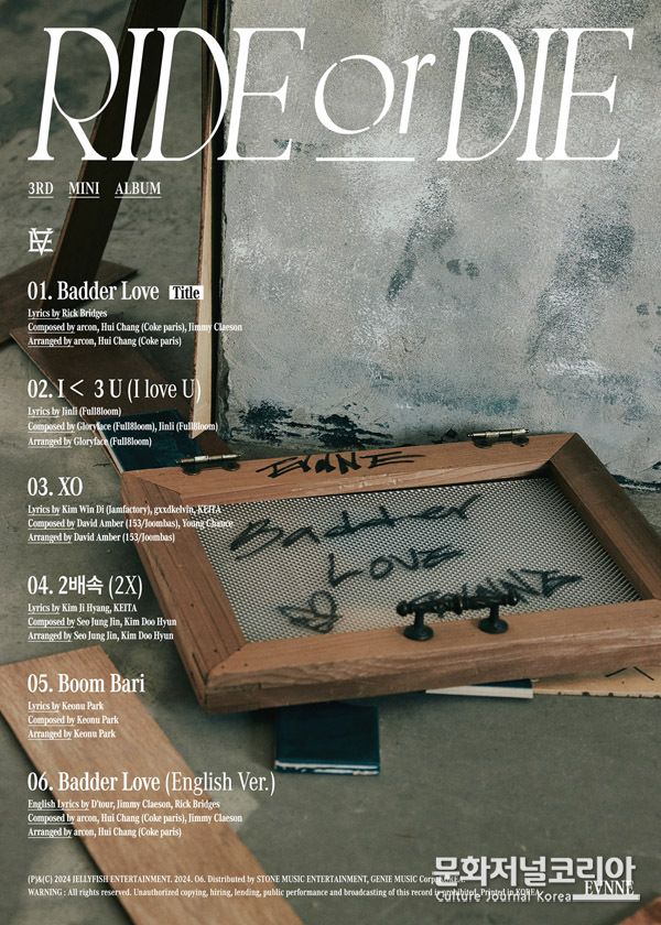 공개된 트랙리스트에 따르면 이븐(EVNNE)의 세 번째 미니 앨범 ‘RIDE or DIE’에는 타이틀곡 ‘Badder Love’를 비롯해 수록곡 ‘I <3 U (I love U)’, ‘XO’, ‘2배속 (2X)’, ‘Boom Bari’, 타이틀곡 ‘Badder Love’ 영어 버전까지 총 6트랙이 담긴다.