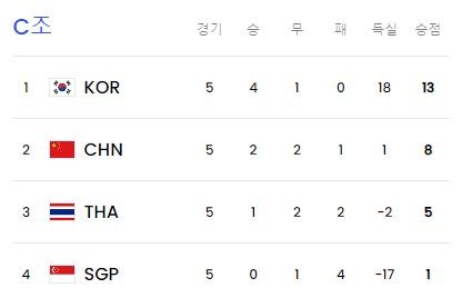 2026 북중미 월드컵 아시아 2차예선 C조 5차전까지 팀 순위./FIFA