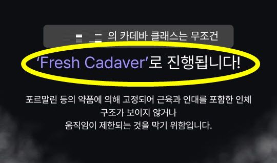 프레시 카데바는 포르말린(포름알데히드) 처리를 하지 않은 상태의 카데바를 말한다. 포르말린 처리를 하면 관절이나 근육이 움직이지 않는 고정된 상태가 된다. 하지만 프레시 카데바는 관절이나 근육을 상세히 확인할 수 있지만 부패가 빠르게 진행될 뿐 아니라 감염위험도 높다. 이를 두고 수료생들은 “이렇게 상태 좋은 카데바는 처음입니다” “막상 해보니 냄새 안 났다” 등의 후기글을 남겨 문제가 되고 있다.