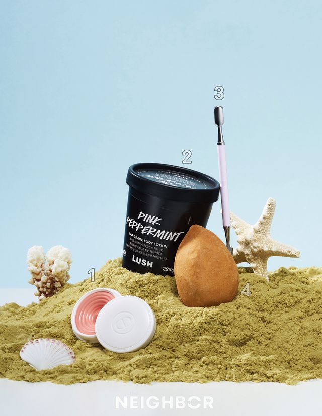 1 Dior 해초 추출물과 아프리콧 오일이 영양을 공급해 건강하게 케어한다. 디올 크렘 아브리콧 8g 4만3000원. 2 Lush 코코아 버터를 듬뿍 넣어 발에 쌓인 피로를 해소하고 촉촉함을 선사한다. 핑크 페퍼민트 225g 4만5000원. 3 Fillimilli 실리콘 핸들 양끝에 용도에 따라 사용할 수 있는 두 가지 팁이 있어 유용하다. 멀티 듀얼 큐티클 푸셔 8500원. 4 Lush 부석 성분이 묵은 각질을 제거하고 오렌지 껍질 오일이 발 전체에 활력을 더한다. 퍼미스 파워 65g 1만2000원.