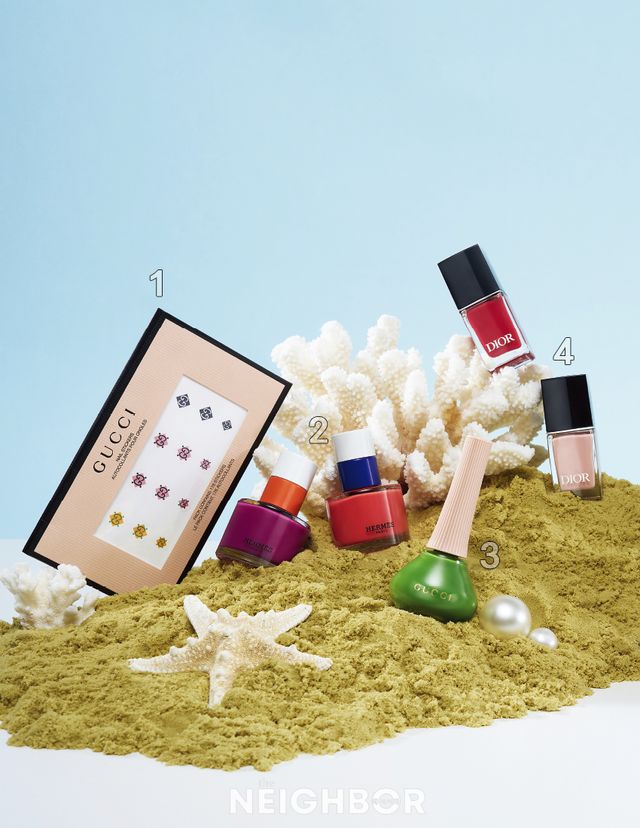1 Gucci Beauty 구찌 아리아 컬렉션을 오마주한 네일 아트 스티커로 아이코닉한 감각을 더할 수 있다. 네일 아트 스티커 가격 미정. 2 Hermès 화사하고 비비드한 컬러가 매혹적인 에나멜 네일로 한 번만 터치해도 선명하게 발색된다. 레 맹 에르메스 15ml 7만2000원. 3 Gucci Beauty 손발톱 표면의 거친 부분과 가장자리까지 커버하고 글로시한 광택이 오래 지속된다. 베르니 아 옹글 10ml 4만4000원. 4 Dior 작약, 피스타치오 추출물을 함유해 바를수록 반짝이면서 균일한 페디 컬러를 연출한다. 베르니 폴리쉬 10ml 4만3000원.