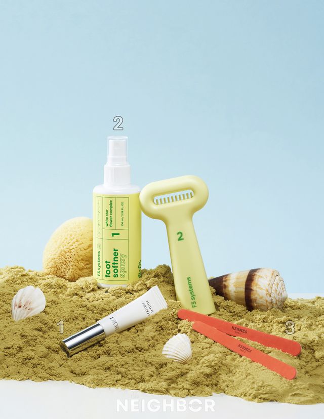 1 Dior 끈적이지 않는 네일 전용 영양 세럼. 건조할 때마다 사용해도 부담 없다. 디올 오일 아브리콧 7.5ml 4만3000원. 2 F3 천연 성분 각질 필러 미스트와 소프너 구성으로 자극 없이 각질 제거가 가능하다. 뿌린대로 거두리라 퍼펙트 풋 필링 키트 1만4000원대. 3 Hermès 파일의 베이지 면으로 전체적인 형태를 다듬고 오렌지 부분으로 정교하고 섬세하게 디자인한다. 레 맹 에르메스 네일 화일 12개 5만3000원.