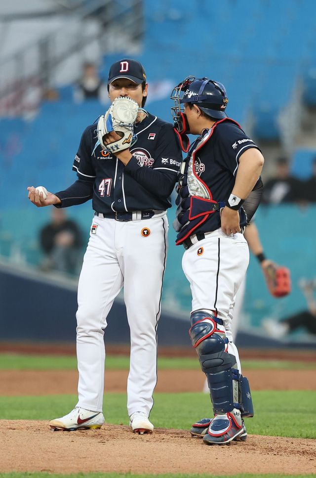 곽빈은 "4월엔 자신감이 너무 없었다. 던지면 모두 맞을 것 같았고, 점수를 줄 것 같았다. 실제로 계속 졌다"며 "그러다 4월 12일 LG 트윈스전(6과 3분의 2이닝 2실점) 때 실마리를 얻었다. '초구부터 전력으로 던지자' '핀포인트 제구 생각하지 말자' '어차피 타자는 못 치니 사인받는 대로 던지자'고 생각하기 시작했다"고 돌아봤다.