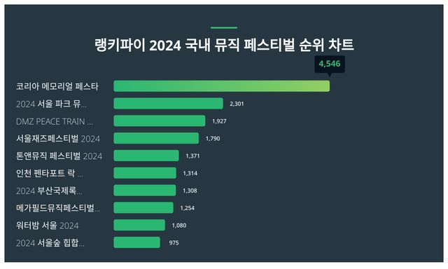차트를 살펴보면 코리아 메모리얼 페스타가 4,546포인트로 해당 부문 1등을 기록했다. 바로 뒤 2024 서울 파크 뮤직 페스티벌이 2,301포인트로 2등을 차지했다.