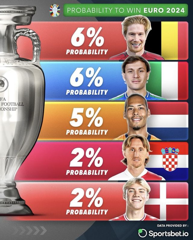 ‘디펜딩 챔피언’인 이탈리아의 우승 가능성은 6%에 그쳤다. 벨기에도 6%다. 그 뒤로는 네덜란드(5%) 크로아티아, 덴마크(이상 2%)가 자리했다.
