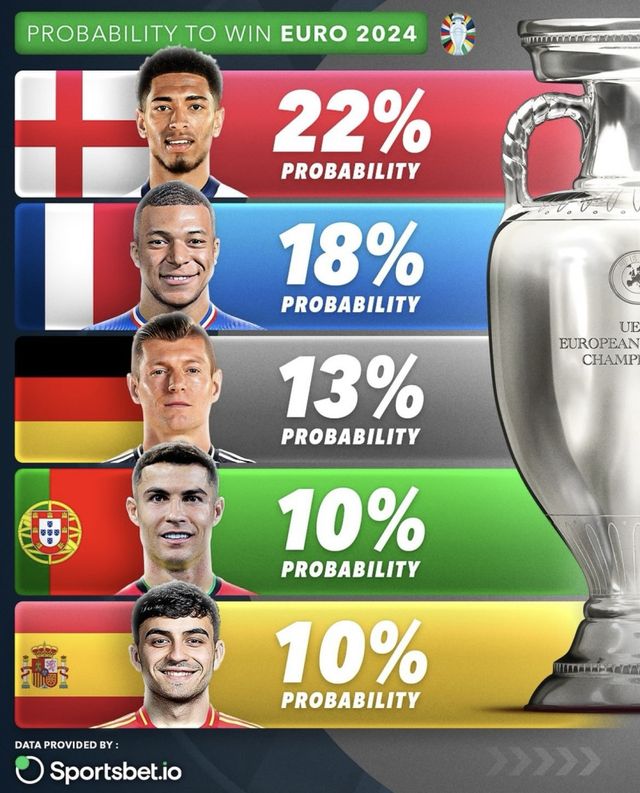 축구 콘텐츠 매체 SCORE 90은 10일(한국시간) 유로 2024에 참가하는 팀들의 우승 가능성을 공개했다. 매체는 스포츠 베팅 최신 배당을 바탕으로 각 팀의 우승 가능성을 점쳤다고 한다.