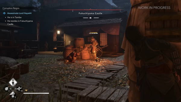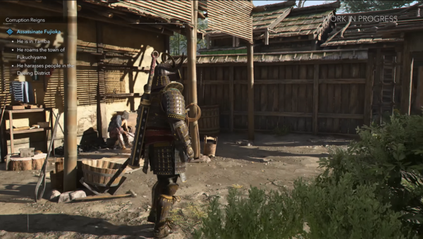 후쿠치야마를 탐험하는 남성 주인공 ‘야스케’의 모습과 전투 장면, 여성 주인공 ‘나오에’의 잠입 플레이 및 전투 등이 영상의 주를 이뤘다. ‘야스케’는 암살 목표인 적에게 정면으로 다가가 맞서는 모습과 함께 육중한 곤봉과 카타나를 전환하며 전투를 치르는 장면이 소개됐다.