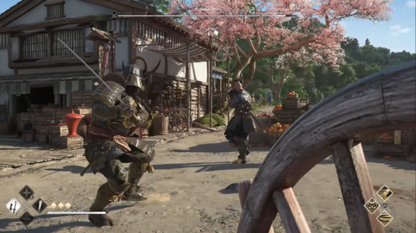 ‘나오에’는 수풀과 지붕 위 등을 활용해 적들을 암살하며 목적지로 향하는 전통적인 ‘어쌔신 크리드’의 플레이와 같은 모습을 보였다. 암살검 외에도 다양한 시노비 도구를 활용하는 모습이 비쳐졌으며, 정면 전투 시에는 사슬낫을 활용해 다수에 맞서는 모습이 부각됐다.