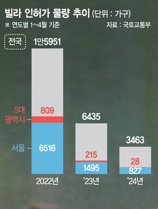 국토교통부에 따르면 올해 1~4월 전국 빌라 인허가 물량은 3463가구로 집계됐다. 이는 2022년 1만5951가구, 2023년 6435가구에 이어 2년 연속 반토막난 수치다. 5대 광역시의 1~4월 인허가 물량은 2022년 809가구에서 2023년 215가구로 줄어든 데 이어 올해는 단 28가구에 불과하다. 2년 새 90% 이상 줄어든 것으로, 관련 통계가 공개된 2007년 이후 최악의 수치다. 특히 광주와 울산은 올해 1~4월 빌라 인허가 물량이 '0가구'를 기록했다. 이는 지방 광역시에서 2010년 이후 처음 있는 일이다.