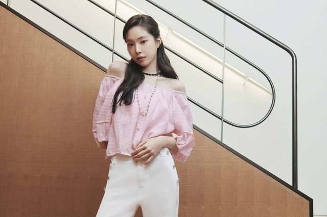 일곱 번째 사진에서는 어깨를 드러낸 핑크 블라우스와 화이트 팬츠로 여성스러움을 극대화했다. 계단에 기대어 있는 그녀의 모습은 패셔너블하면서도 편안한 분위기를 자아낸다.