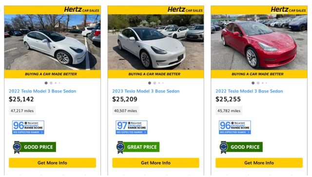 현재 허츠 웹사이트에는 100대 이상의 모델 3가 2만5,000달러 미만의 가격으로 판매되고 있으며, 모두 주행거리가 5만~10만 마일 정도다.