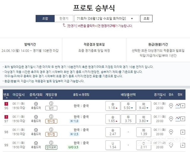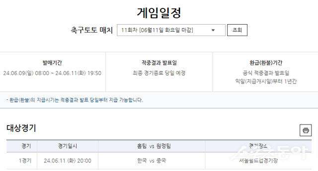 국민체육진흥공단에서 발행하는 체육진흥투표권 스포츠토토의 수탁사업자 스포츠토토코리아가 11일(화) 오후 8시 서울월드컵경기장에서 열리는 ‘2026 FIFA 북중미월드컵’ 아시아 2차 예선 C조 6차전 한국(홈)-중국(홈)전을 대상으로 발행한 프로토 승부식 71회차 게임의 마감이 임박했다.
