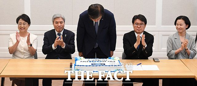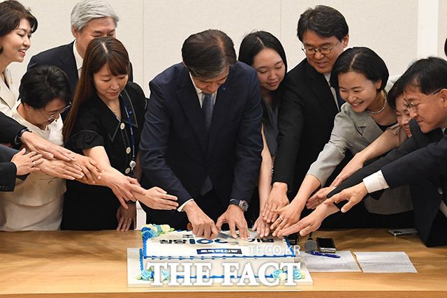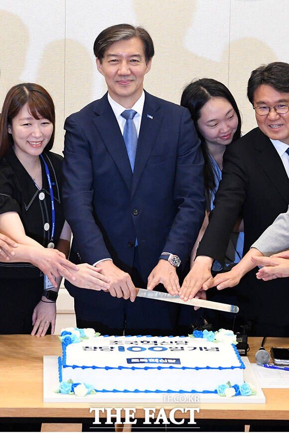 [더팩트ㅣ국회=남윤호 기자] 조국 조국혁신당 대표를 비롯한 당 관계자들이 11일 오전 서울 여의도 국회에서 열린 창당 100일 기념행사에서 케이크 커팅을 하고 있다.