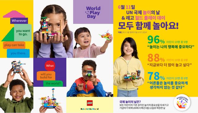 레고그룹은 첫 ‘국제 놀이의 날’을 기념해 놀이의 힘을 전 세계에 알리기 위한 자체 기념일인 ‘월드 플레이 데이(World Play Day)’를 같은 날 실시한다. 그 일환으로 놀이 인식 개선의 필요성을 알리기 위한 연구조사 결과를 발표했다. 조사는 전문 기관을 통해 지난해 12월부터 지난 1월까지 한국을 포함한 36개국 부모 약 3만 6000명, 어린이 약 2만 5000명을 대상으로 진행됐다.