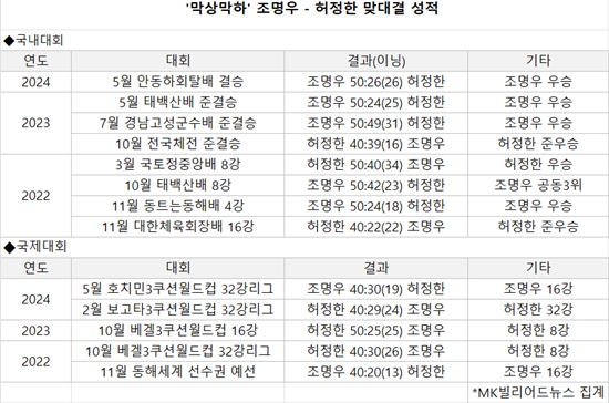 특히 조명우는 허정한을 이긴 국내대회에서는 4번이나 우승 트로피를 들었다. 조명우가 허정한에게 승리하면 우승 가능성이 높은 셈이다. 반대로 허정한은 조명우를 이긴 국내대회에서 우승 1회, 준우승 2회를 기록했다.