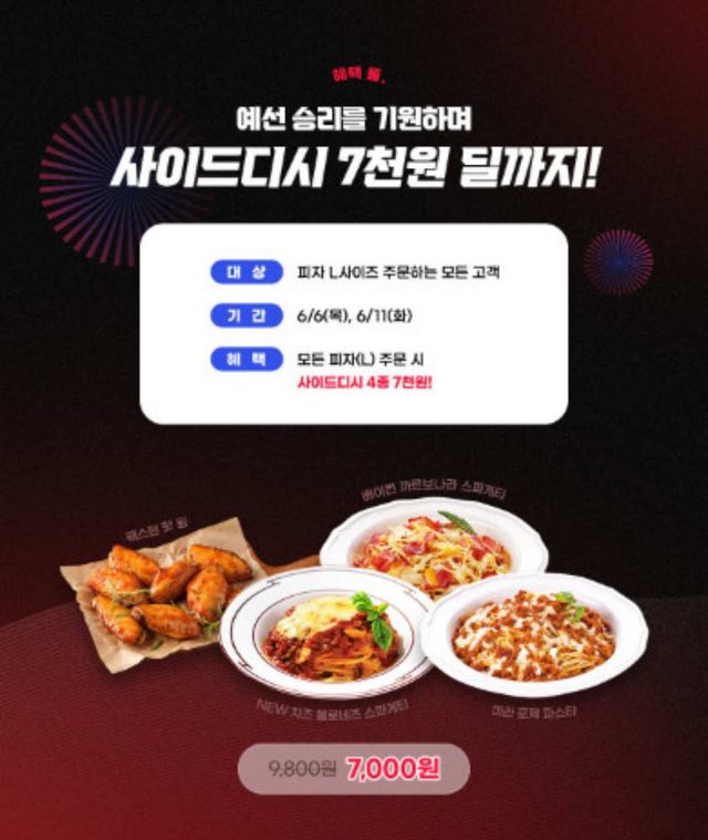 사이드디시 7천 원 프로모션은 모든 피자 L 사이즈 온라인 배달 및 포장 주문 시 1회에 한해, 9800원인 사이드디시 4종(마라 로제 파스타, 베이컨 까르보나라 스파게티, NEW치즈 볼로네즈 스파게티, 웨스턴 핫윙)를 7천원에 구매 가능하다.