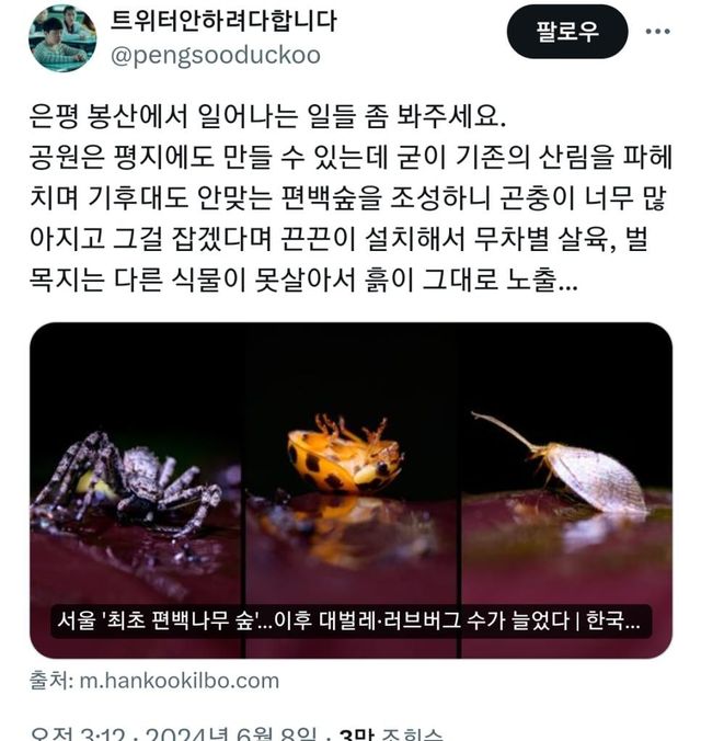 원래 잘살던 나무들 싹 베고 기후에도 안 맞는 나무들만 억지로 심어놔서 생태계가 망가짐