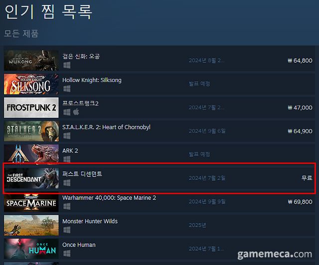 ▲ 6월 11일 기준 스팀 인기 찜 목록 6위를 기록 중인 퍼스트 디센던트 (자료출처: 스팀 공식 페이지)