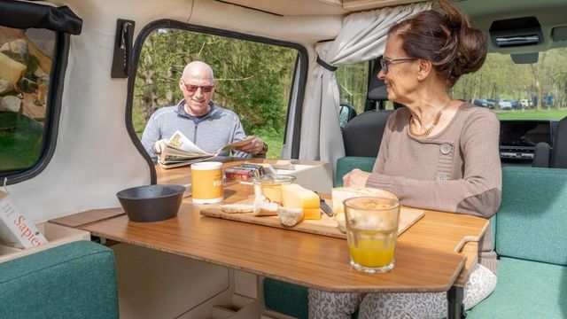 캠핑카를 자세히 살펴보면 우선 차량의 팝업 루프 덕분에 내부 공간과 머리 위 공간을 최대화할 수 있다. 또한, 두 개의 벤치가 테이블 주위에 배치돼 혁신적인 좌석 공간을 자랑한다. 이를 잘 활용하면 코너 소파 혹은 침대로도 사용할 수 있다.