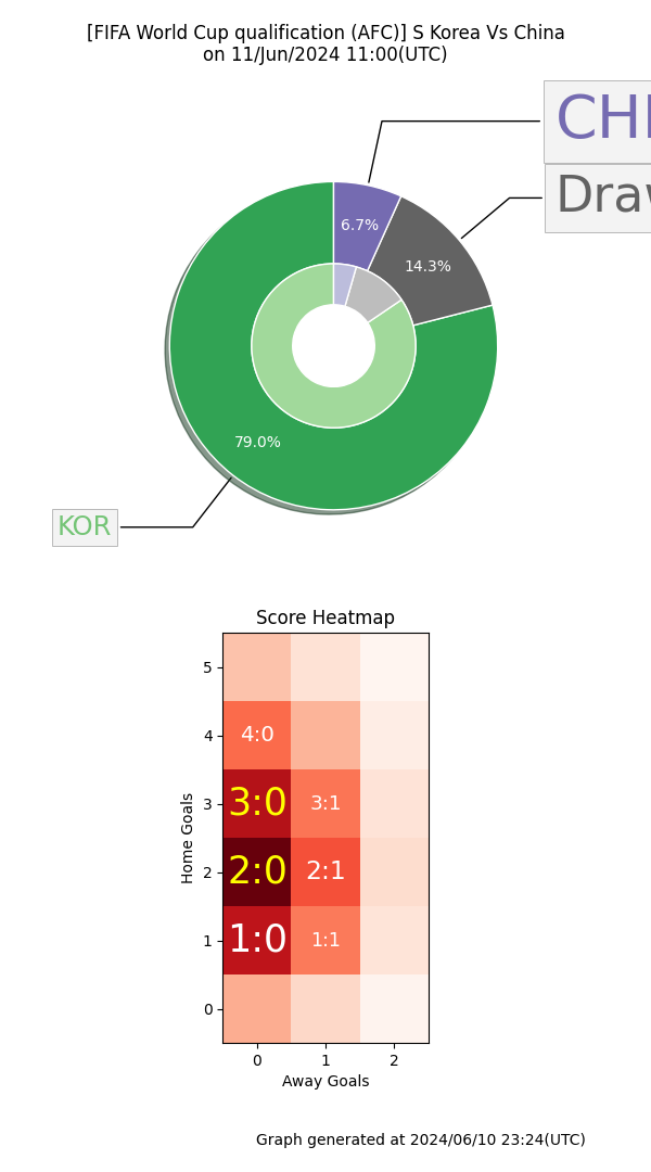 이 분석에 따르면 정규시간 승무패 확률은 한국 승리 79%, 무승부 14.3%, 중국 승리 6.7%다.