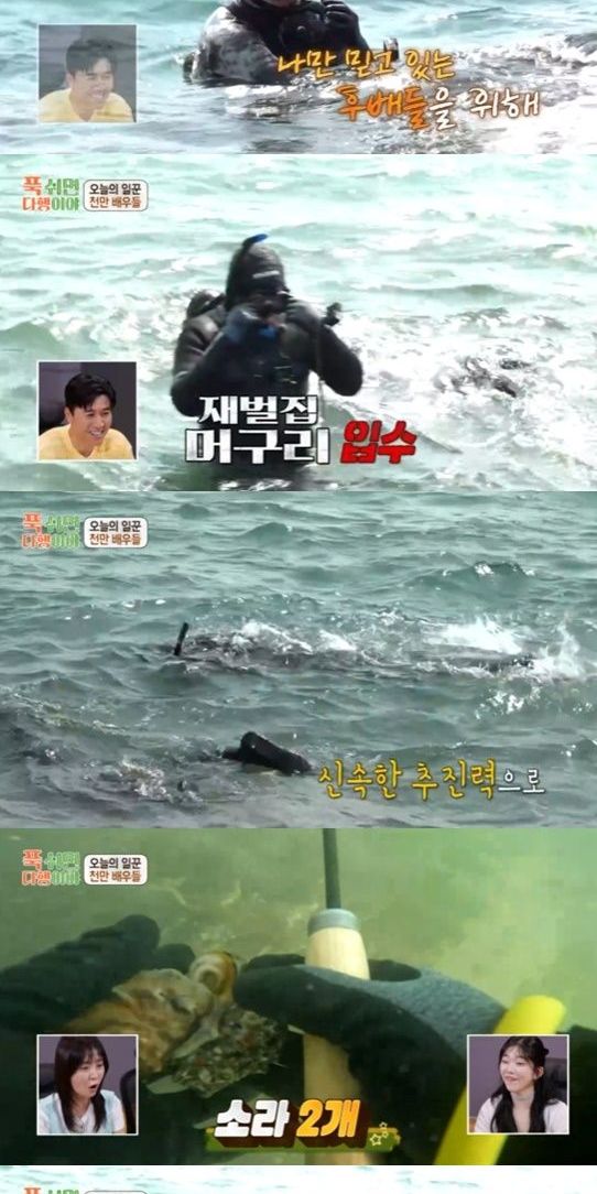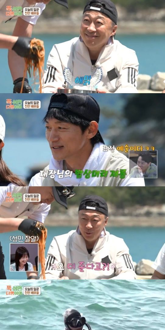 바다로 나가 첫 ‘내손내잡’에 나선 이성민은 필사의 몸부림을 치면서도 넘치는 추친력으로 바로 소라 2개를 캤고 동생들을 위해 톳과 미역을 한가득 채취했다. 작은 칠게를 보고 괴성을 지르고 오두방정을 떨어 웃음을 자아내기도 했다.