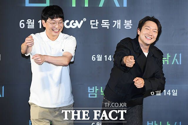 문병곤 감독(왼쪽)과 배우 손석구가 11일 오후 서울 용산구 CGV 용산 아이파크몰에서 열린 영화 '밤낚시' 제작보고회에 참석해 낚싯대 던지는 포즈를 취하고 있다. /장윤석 기자