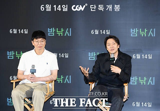 문병곤 감독(왼쪽)과 배우 손석구가 11일 오후 서울 용산구 CGV 용산 아이파크몰에서 열린 영화 '밤낚시' 제작보고회에 참석해 취재진의 질문에 답하고 있다. /장윤석 기자